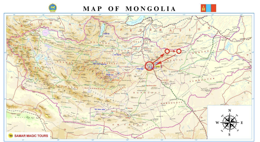 Iniciaremos la ruta en el Nuevo Aeropuerto «Genghis´´ Khan de Ulán Bator (inaugurado el 03 de Julio del 2021, localizado a 52 km/32,3 millas, +2-3 horas de viaje, dependiendo del tráfico), capital de Mongolia con la recepción por el equipo de Samar Magic Tours. Esta es una de las rutas más interesantes de Mongolia. A continuación, partida en dirección N/E a visitar la Estatua Ecuestre de Genghis Khan. En la base de la estatua, los visitantes pueden ver la réplica del legendario látigo de oro del Gran Khan. Los turistas pueden subir en ascensor por el interior de la estatua. La salida está a la altura de la entrepierna de Genghis Khan, desde donde se puede caminar hasta la cabeza del caballo para ver un gran panorama de la estepa. Visitaremos un pequeño museo de la Edad del Bronce, localizado en el sótano de la Estatua Ecuestre de Genghis Khan. Salida en dirección N/E al Parque Nacional Gorkhi/Terelj, ubicado a 1600 m de altura sobre el nivel del mar, con altas rocas graníticas del Mesozoico, montañas, estepas, bosques alpinos y grandes formaciones rocosas de curiosas formas del Mesozoico como es la Roca de la Tortuga, etc. Está ubicado a los pies de las montañas Khenti, la región donde nació Genghis Khan. Fue declarado Parque Nacional en el año 1993, y cubre un área de 300.000 hectáreas. A continuación, partida en dirección OESTE, para atender un Auténtico Espectáculo Nómada Mongol, demuestra la forma de vida tradicional de los nómadas de Mongolia, la cría y el uso de cinco tipos de ganado en movimiento de un lugar a otro, utilizando carretas de bueyes, yaks, camellos y caballos. Gran parte de la población mongola sigue siendo nómada, desplazándose de un lugar a otro a caballo o a camello o en yak, con sus Gers y rebaños, y el encuentro ocasional con una de estas familias y su modo de vida es una experiencia inolvidable.