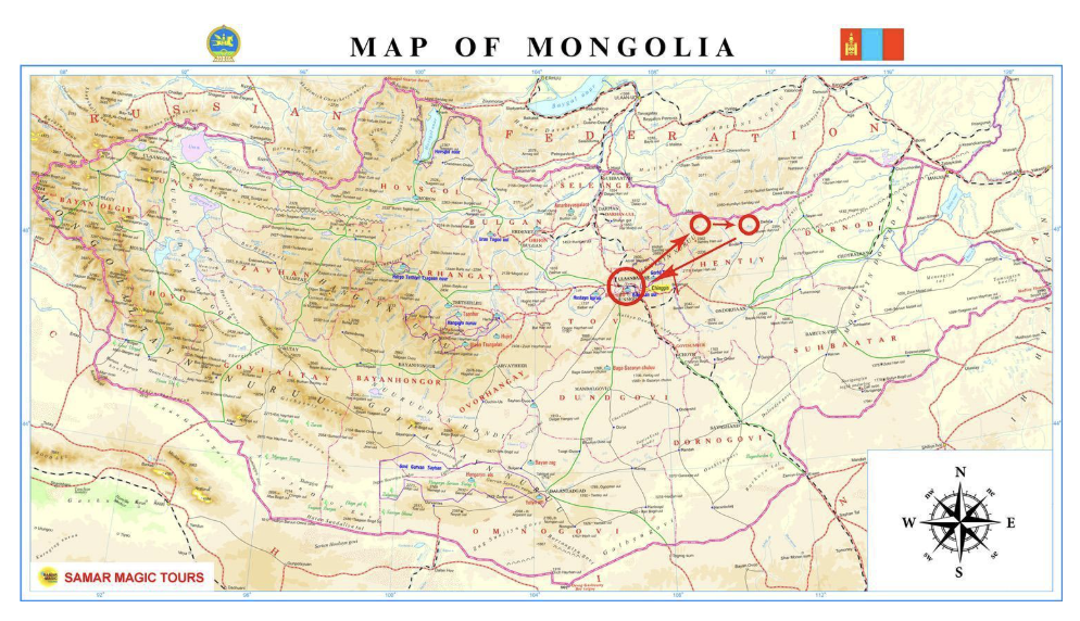 Iniciaremos la ruta en el nuevo aeropuerto «Genghis´´ Khan de Ulán Bator (inaugurado el 03 de Julio del 2021, localizado a 52 km/32,3 millas, +2-3 horas de viaje, dependiendo del tráfico), capital de Mongolia con la recepción por el equipo de Samar Magic Tours. Esta es una de las rutas más interesantes de Mongolia. A continuación, partida en dirección N/E a visitar la Estatua Ecuestre de Genghis Khan. En la base de la estatua, los visitantes pueden ver la réplica del legendario látigo de oro del Gran Khan. Los turistas pueden subir en ascensor por el interior de la estatua. La salida está a la altura de la entrepierna de Genghis Khan, desde donde se puede caminar hasta la cabeza del caballo para ver un gran panorama de la estepa. Visitaremos un pequeño museo de la Edad del Bronce, localizado en el sótano de la Estatua Ecuestre de Genghis Khan. Salida en dirección N/E al Parque Nacional Gorkhi/Terelj, ubicado a 1600 m de altura sobre el nivel del mar, con altas rocas graníticas del Mesozoico, montañas, estepas, bosques alpinos y grandes formaciones rocosas de curiosas formas del Mesozoico como es la Roca de la Tortuga o el Monje Leyendo el Libro, etc. Está ubicado a los pies de las montañas Khenti, la región donde nació Genghis Khan. Fue declarado Parque Nacional en el año 1993, y cubre un área de 300.000 hectáreas. A continuación, partida en dirección OESTE, para atender un Auténtico Espectáculo Nómada Mongol, demuestra la forma de vida tradicional de los nómadas de Mongolia, la cría y el uso de cinco tipos de ganado en movimiento de un lugar a otro, utilizando carretas de bueyes, yaks, camellos y caballos. Gran parte de la población mongola sigue siendo nómada, desplazándose de un lugar a otro a caballo o a camello o en yak, con sus Gers y rebaños, y el encuentro ocasional con una de estas familias y su modo de vida es una experiencia inolvidable.