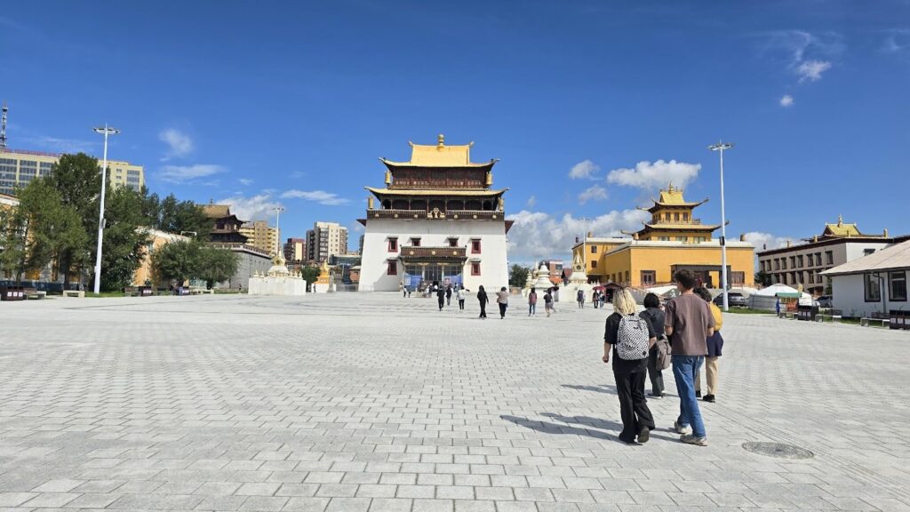 -En la primera parte de este gran viaje, visitaremos el gran monasterio de «Gandantegchinlin´´, o monasterio de «Gandan´´, es un histórico monasterio budista en Ulán Bator, conocido como «Gran Lugar de Absoluto Regocijo». Fundado en 1809, fue el único monasterio activo en el país entre 1944 y 1989, y actualmente alberga varios cientos de monjes, siendo el centro del budismo en Mongolia. Su mayor atractivo es una imponente estatua de unos 25 metros de altura. En su interior, podrás presenciar ceremonias budistas tradicionales, que incluyen rezos colectivos, mantras y rituales de oración que buscan la paz interior y el equilibrio espiritual.